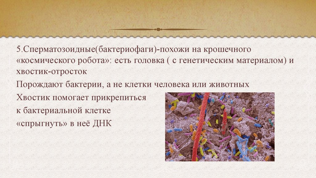 5.Сперматозоидные(бактериофаги)-похожи на крошечного«космического робота»: есть головка ( с генетическим материалом) и