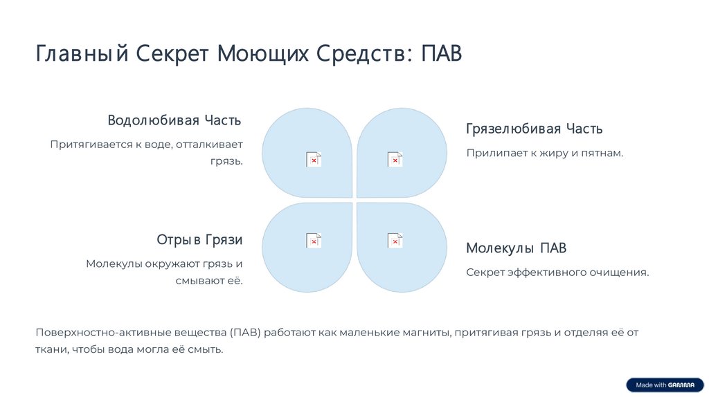 Поверхностно-активные вещества (ПАВ) работают как маленькие магниты, притягивая грязь и отделяя её от