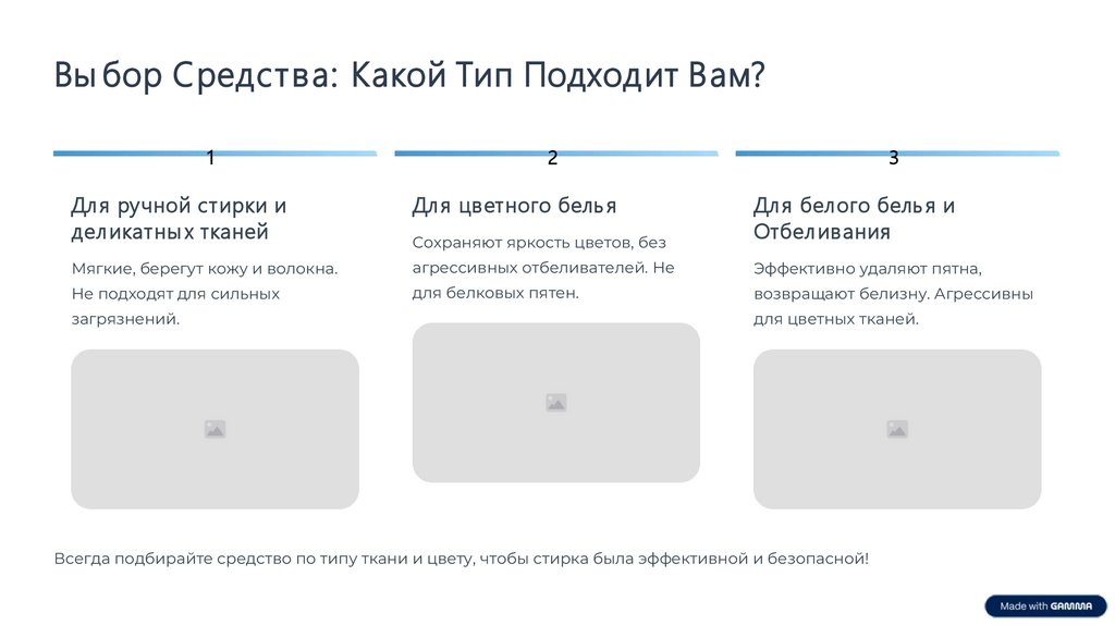Всегда подбирайте средство по типу ткани и цвету, чтобы стирка была эффективной и безопасной!