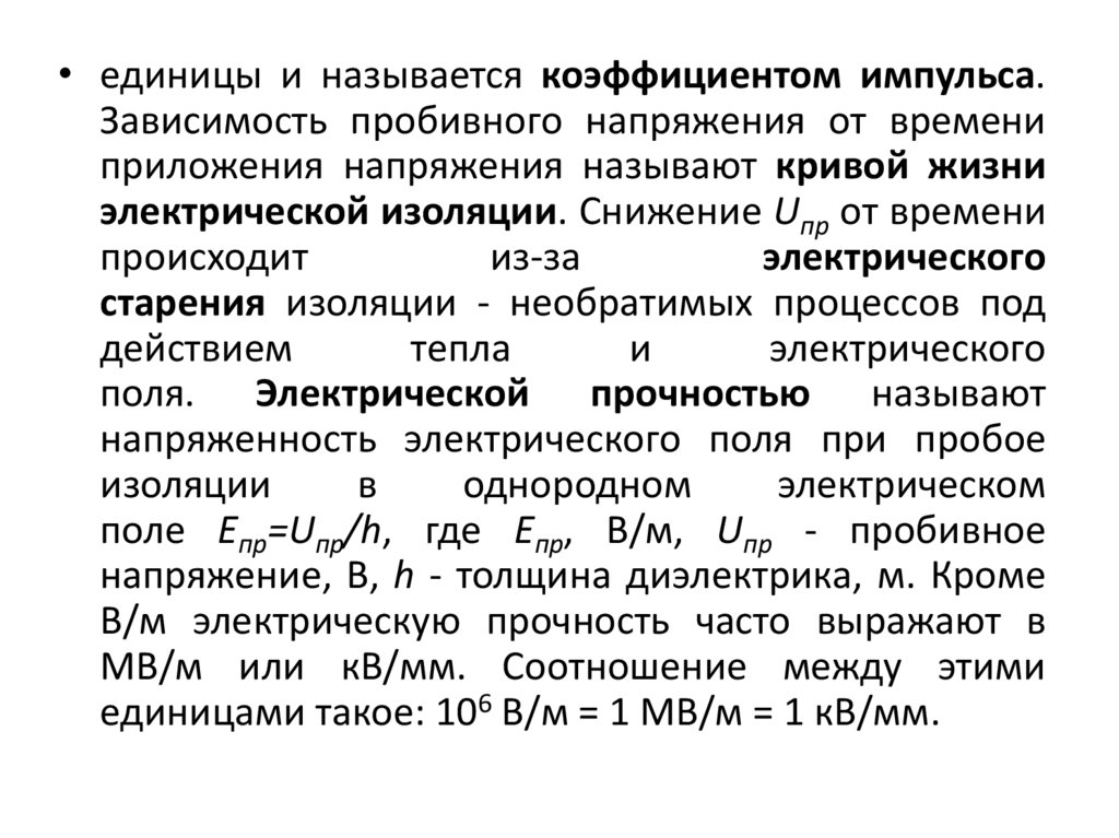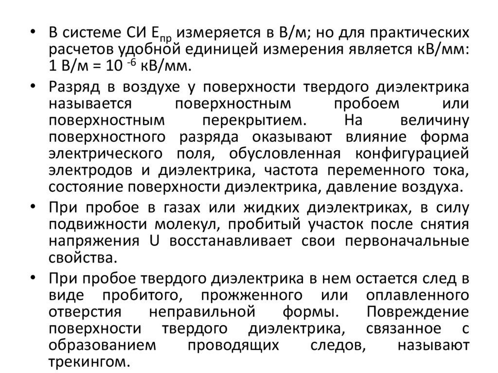 • В системе СИ Епр измеряется в В/м; но для практическихрасчетов удобной единицей измерения является кВ/мм: