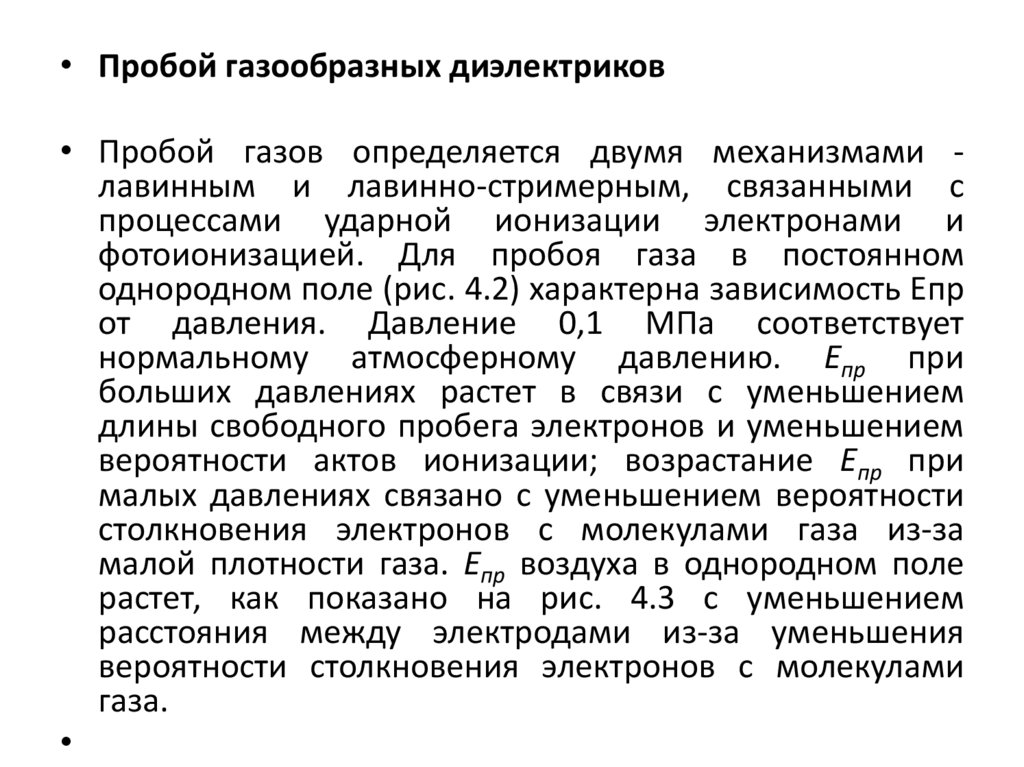 • Пробой газообразных диэлектриков• Пробой газов определяется двумя механизмами лавинным и лавинно-стримерным, связанными с