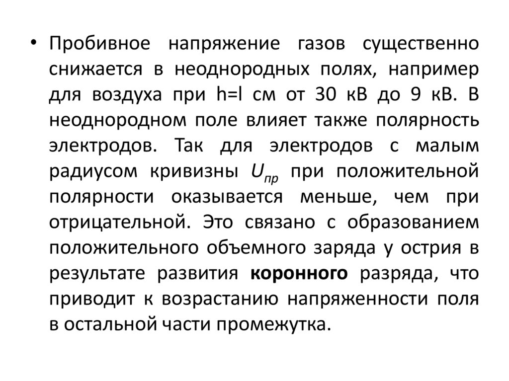 • Пробивное напряжение газов существенноснижается в неоднородных полях, например