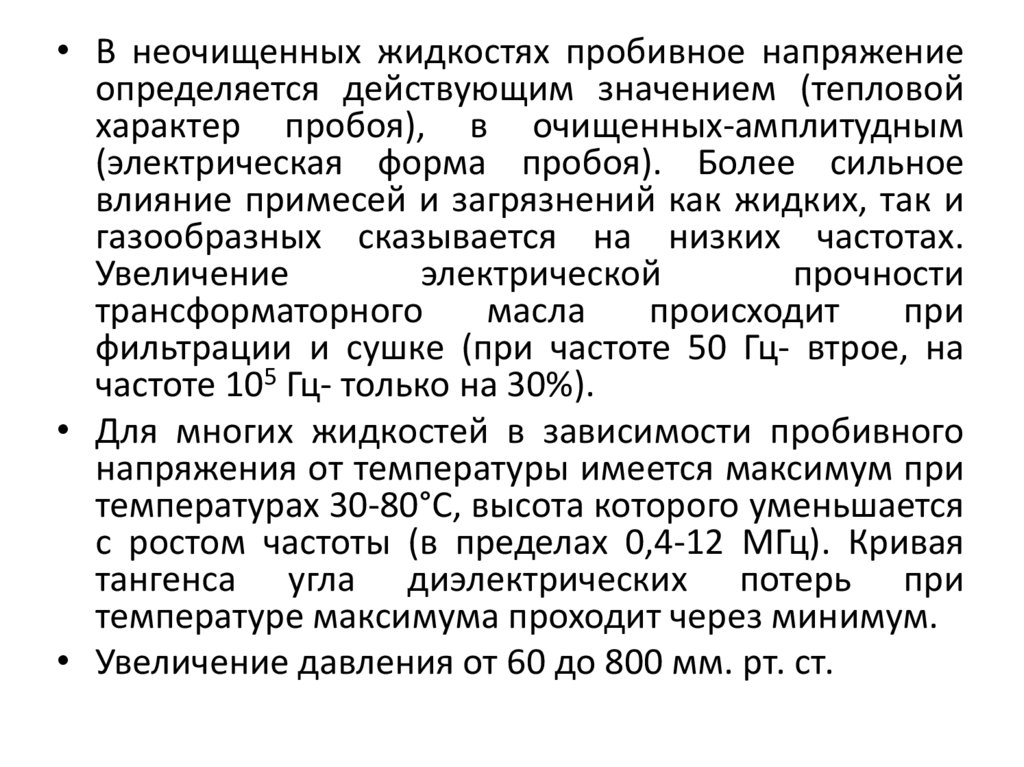 • В неочищенных жидкостях пробивное напряжениеопределяется действующим значением (тепловой