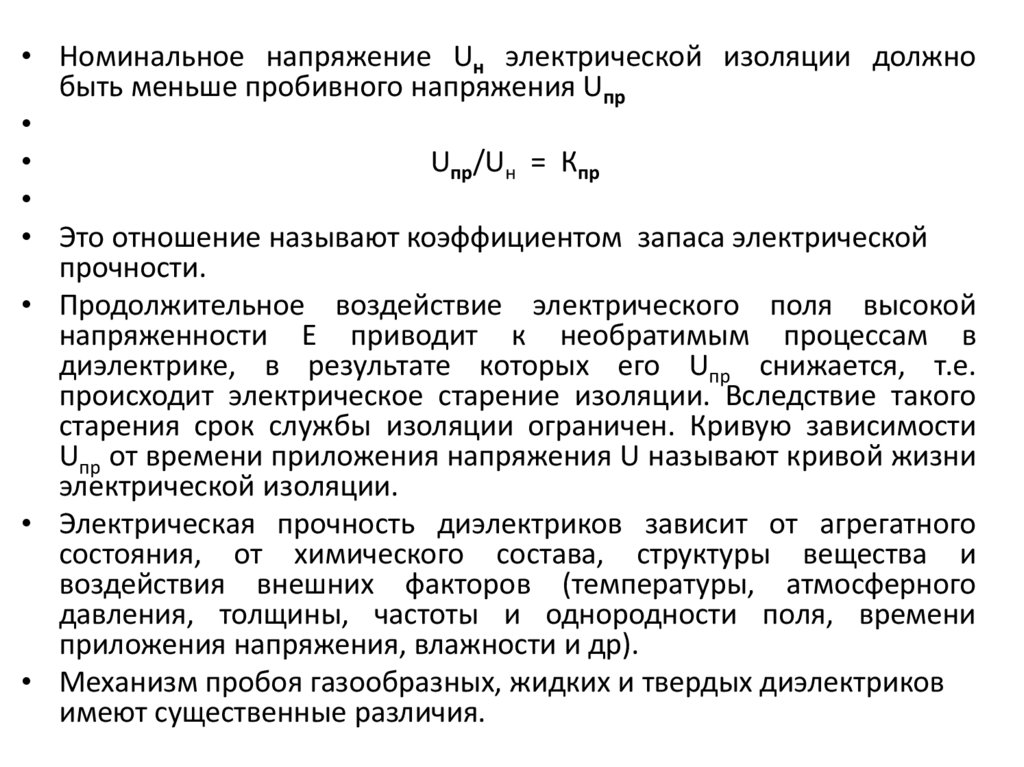 • Номинальное напряжение Uн электрической изоляции должнобыть меньше пробивного напряжения Uпр