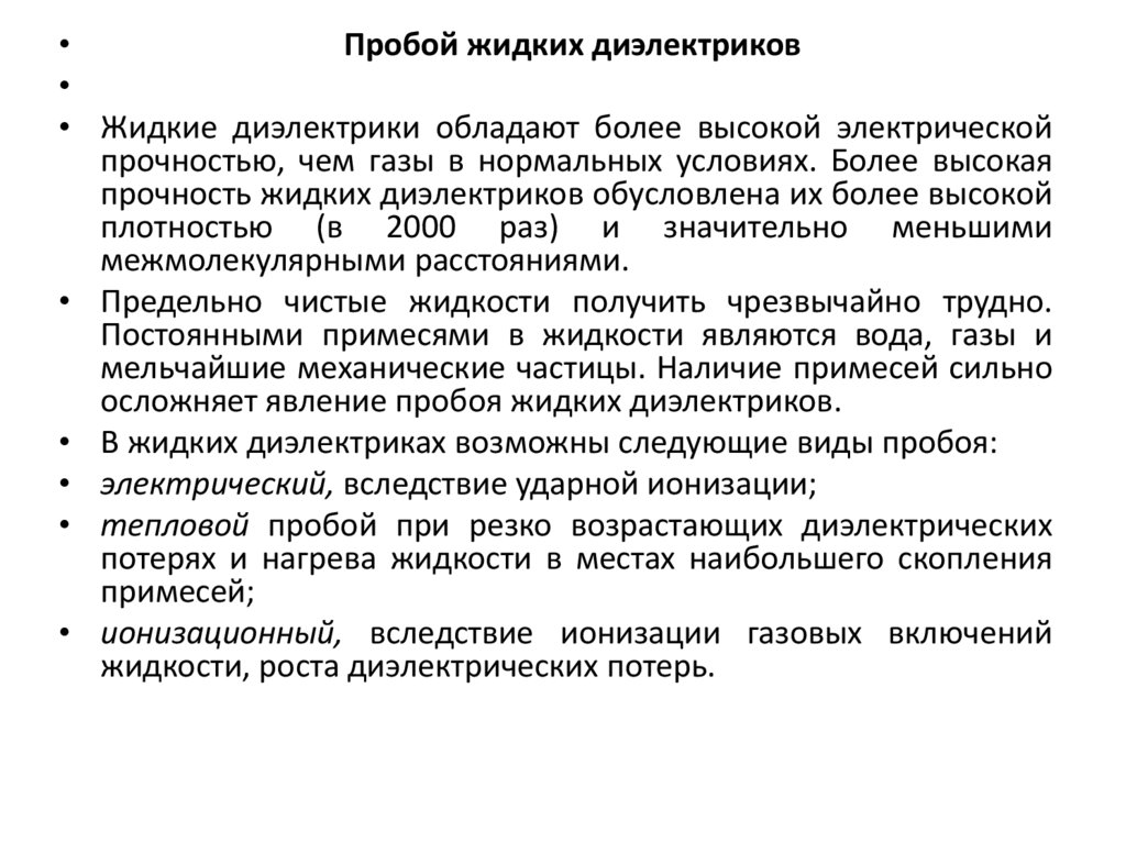 • В жидких диэлектриках возможны следующие виды пробоя: