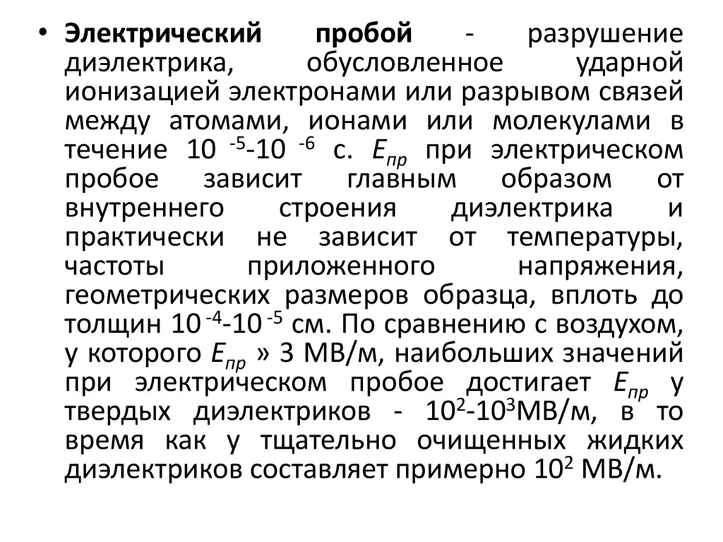 • Тепловой пробой обычно происходит в течение 10 -2 -10 3 с, а E около 10 МВ/м.