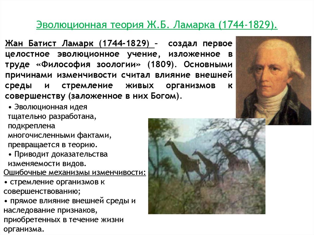Эволюционная теория Ж.Б. Ламарка (1744-1829).Жан Батист Ламарк (1744-1829) – создал первое