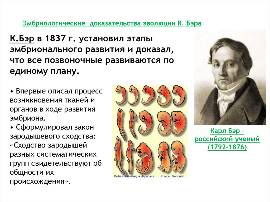 Эмбриологические доказательства эволюции К. БэраК.Бэр в 1837 г. установил этапы