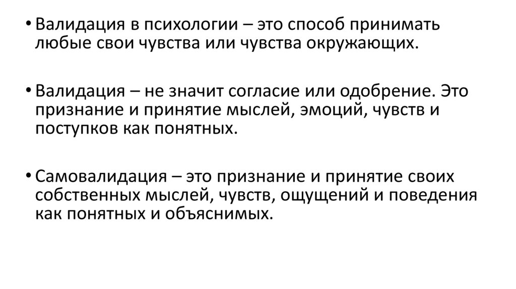 • Валидация в психологии – это способ приниматьлюбые свои чувства или чувства окружающих.