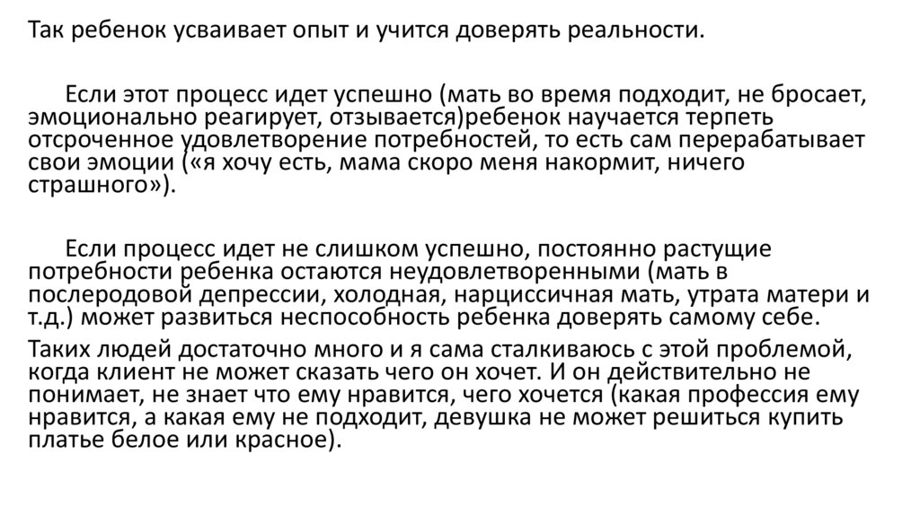 Так ребенок усваивает опыт и учится доверять реальности.Если этот процесс идет успешно (мать во время подходит, не бросает,