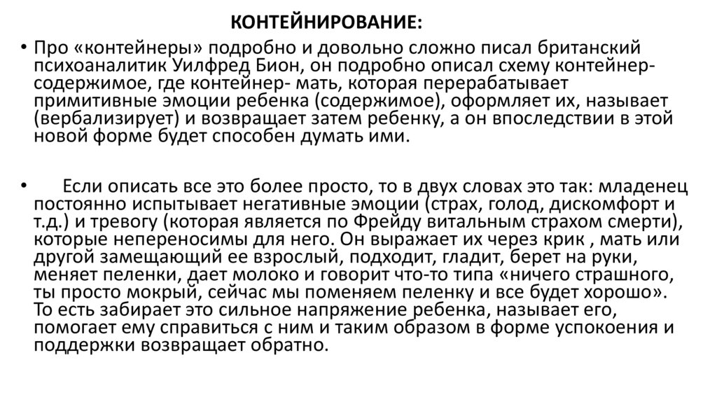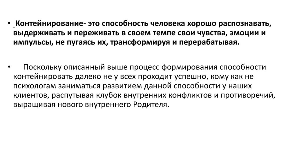 • Контейнирование- это способность человека хорошо распознавать,выдерживать и переживать в своем темпе свои чувства, эмоции и