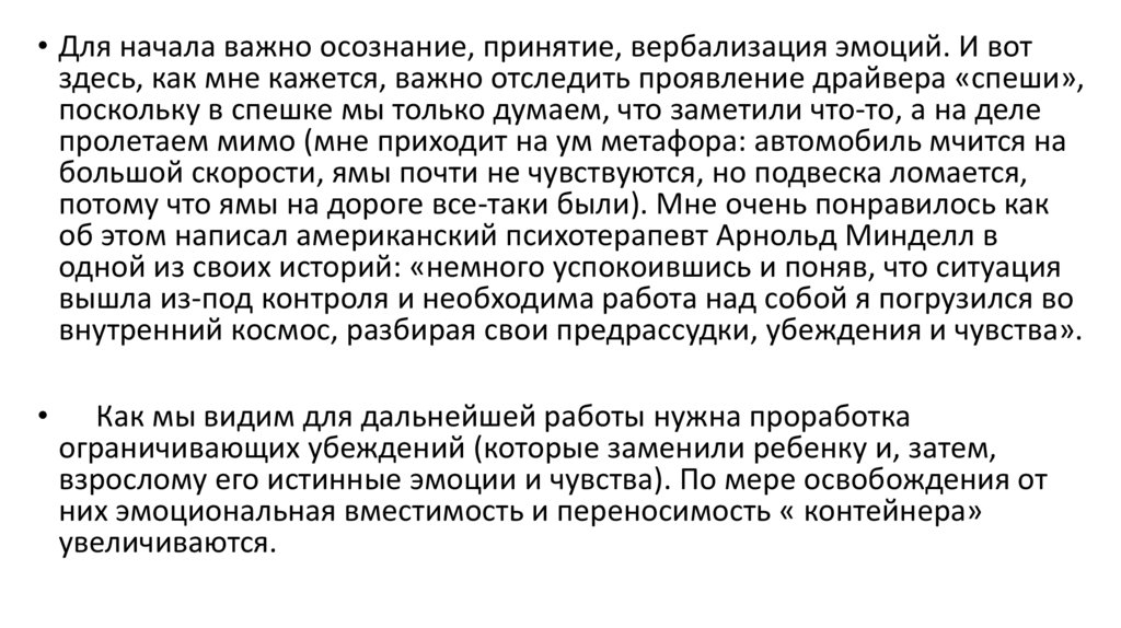 • Для начала важно осознание, принятие, вербализация эмоций. И вотздесь, как мне кажется, важно отследить проявление драйвера «спеши»,