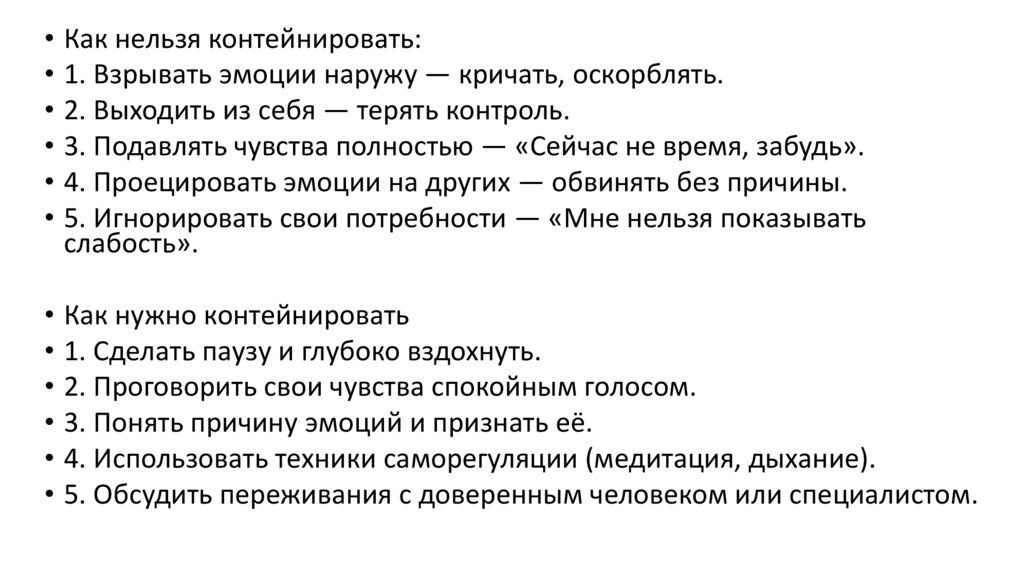 • Как нельзя контейнировать:• 1. Взрывать эмоции наружу — кричать, оскорблять.