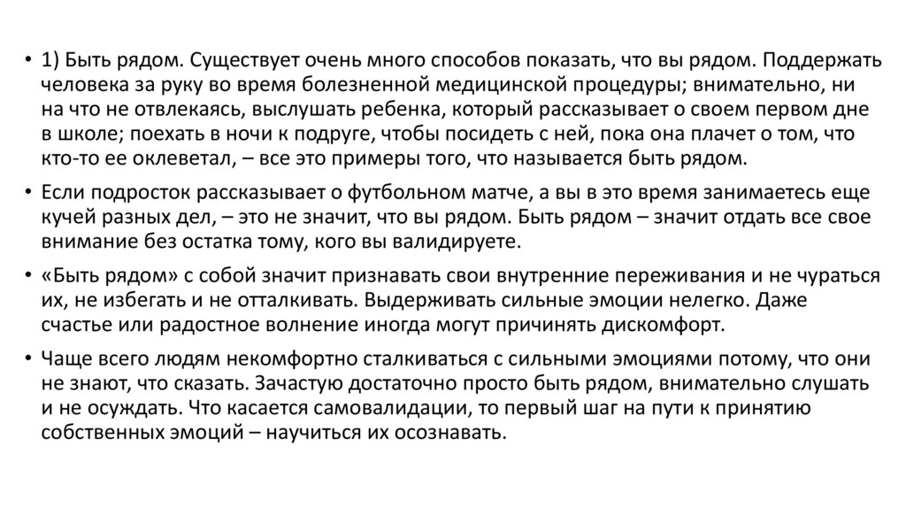 • 1) Быть рядом. Существует очень много способов показать, что вы рядом. Поддержатьчеловека за руку во время болезненной медицинской процедуры; внимательно, ни