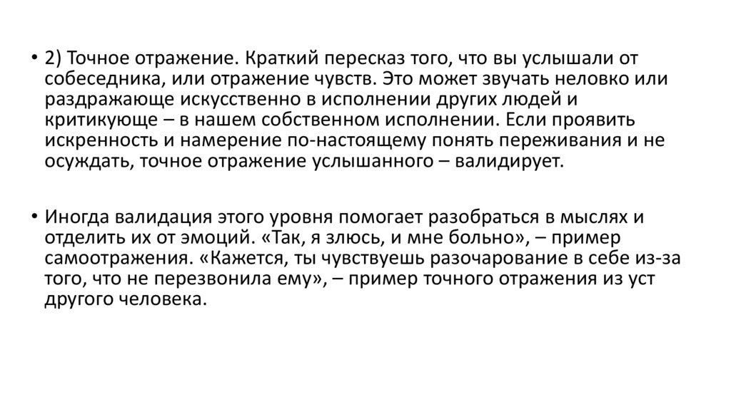 • 2) Точное отражение. Краткий пересказ того, что вы услышали отсобеседника, или отражение чувств. Это может звучать неловко или