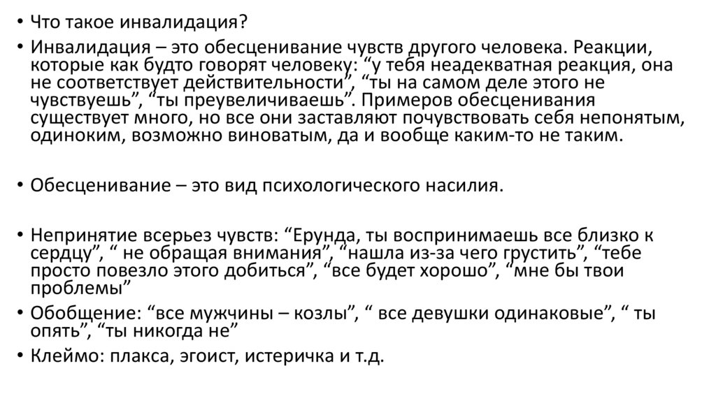 • Что такое инвалидация?• Инвалидация – это обесценивание чувств другого человека. Реакции,