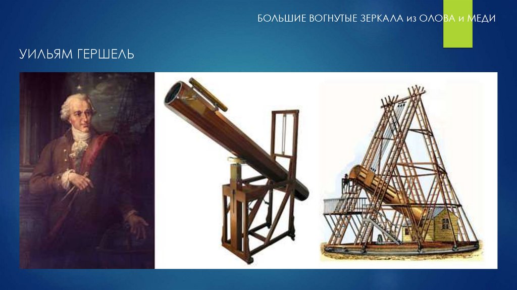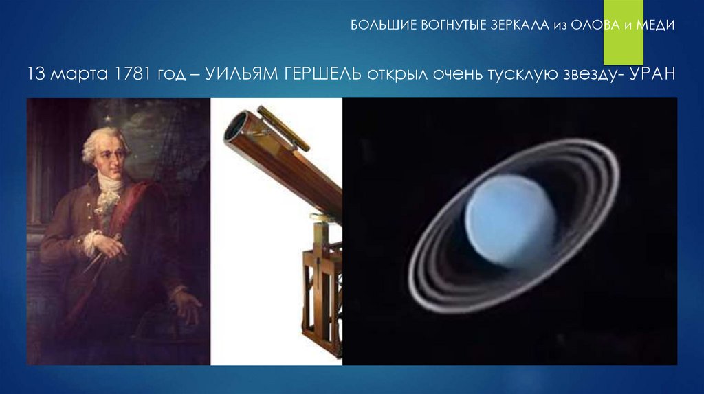 БОЛЬШИЕ ВОГНУТЫЕ ЗЕРКАЛА из ОЛОВА и МЕДИ13 марта 1781 год – УИЛЬЯМ ГЕРШЕЛЬ открыл очень тусклую звезду- УРАН