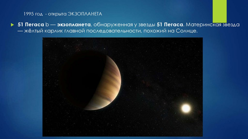 1995 год - открыта ЭКЗОПЛАНЕТА51 Пегаса b — экзопланета, обнаруженная у звезды 51 Пегаса. Материнская звезда