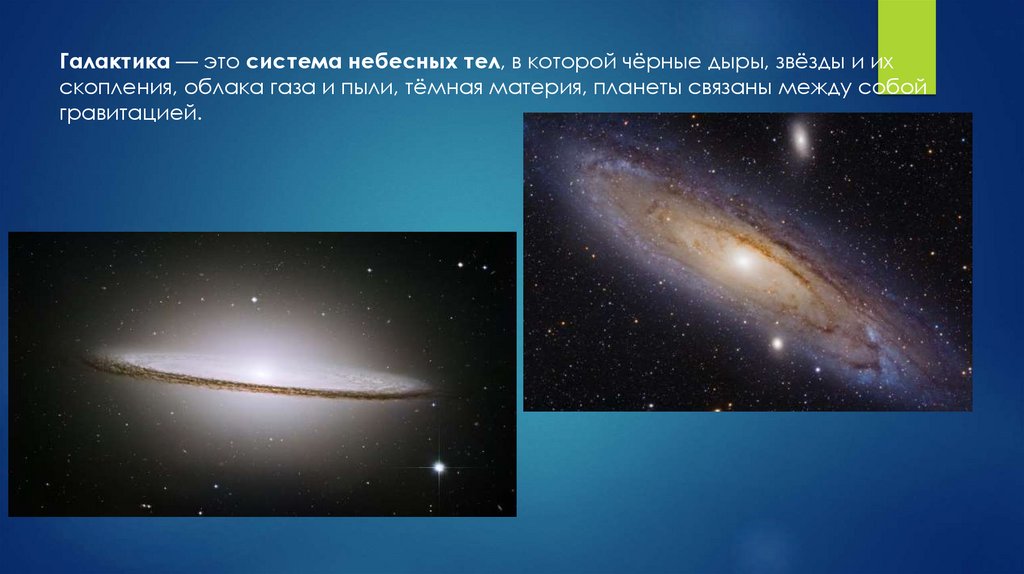 Галактика — это система небесных тел, в которой чёрные дыры, звёзды и ихскопления, облака газа и пыли, тёмная материя, планеты связаны между собой