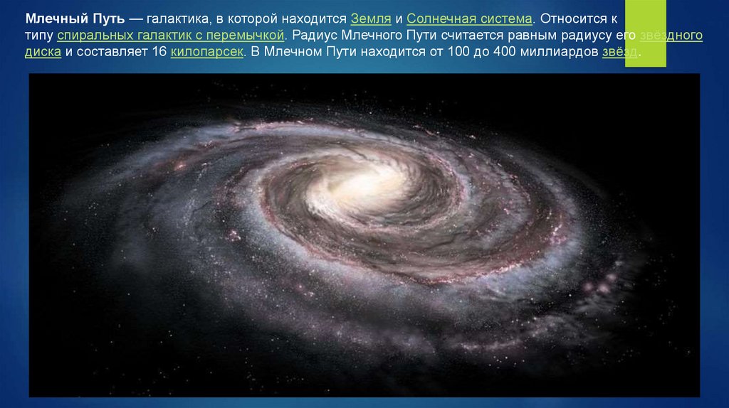 Млечный Путь — галактика, в которой находится Земля и Солнечная система. Относится ктипу спиральных галактик с перемычкой. Радиус Млечного Пути считается равным радиусу его звёздного