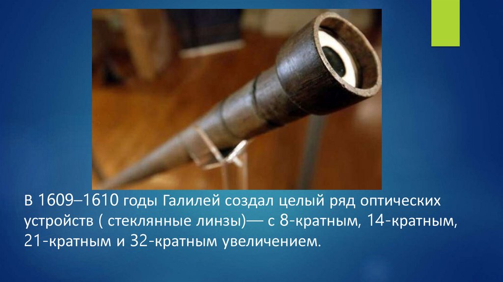 В 1609–1610 годы Галилей создал целый ряд оптическихустройств ( стеклянные линзы)— с 8-кратным, 14-кратным,