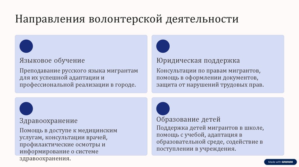 Выберите направление деятельности: языковое обучение, юридическая помощь, здравоохранение,