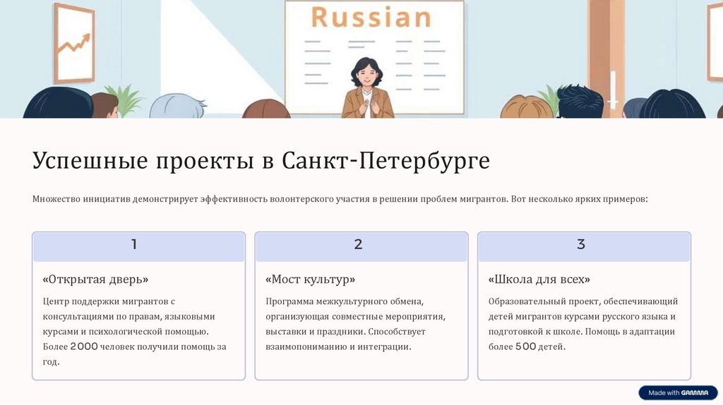 Успешные проекты в Санкт-ПетербургеМножество инициатив демонстрирует эффективность волонтерского участия в решении проблем мигрантов. Вот несколько ярких примеров: