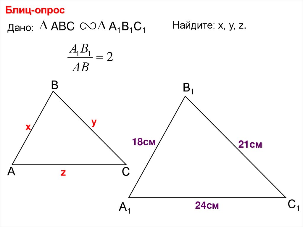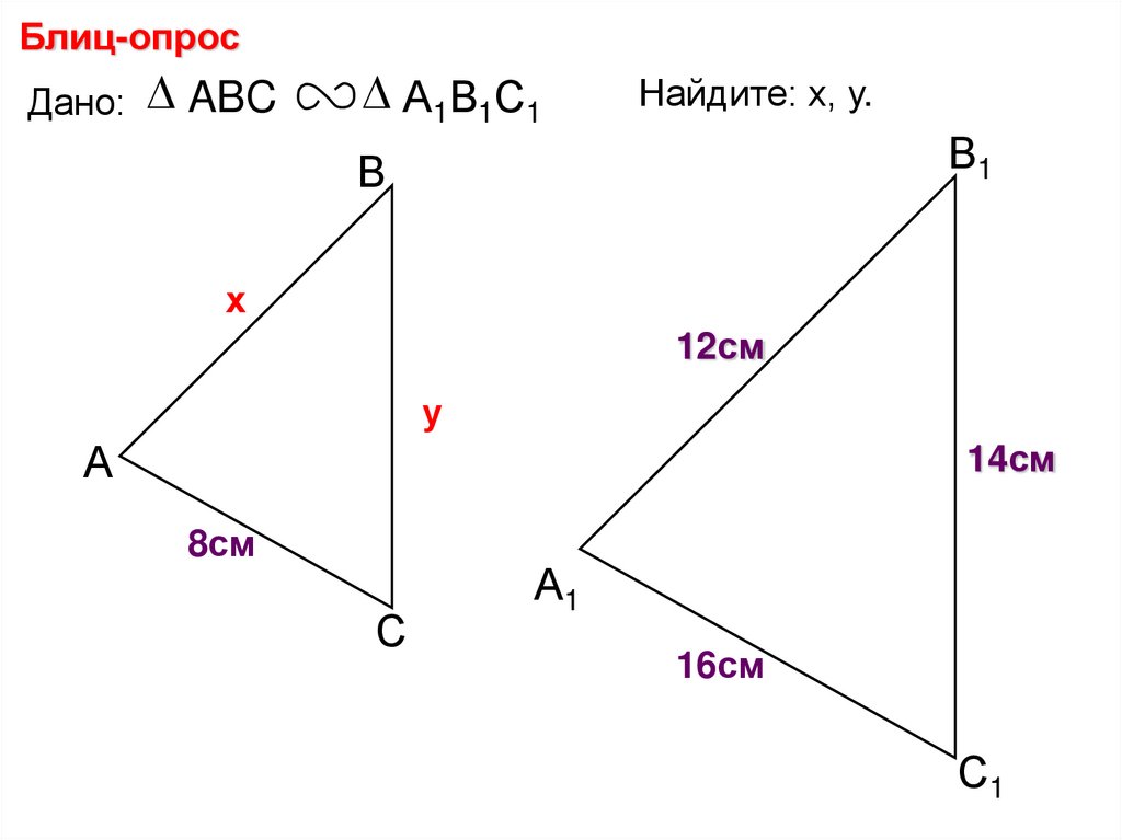 Найти неизвестные стороны и углы подобных треугольников.Дано: ABC