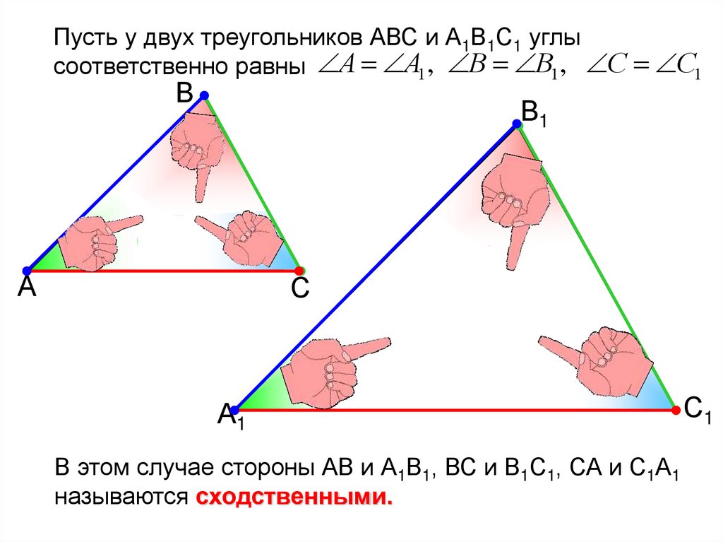 Два треугольника называются подобными, если их углысоответственно равны и стороны одного треугольника