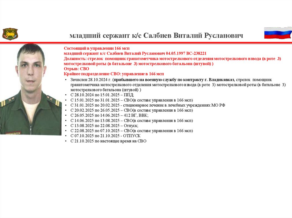 младший сержант к/c Салбиев Виталий РуслановичСостоящий в управлении 166 мсп