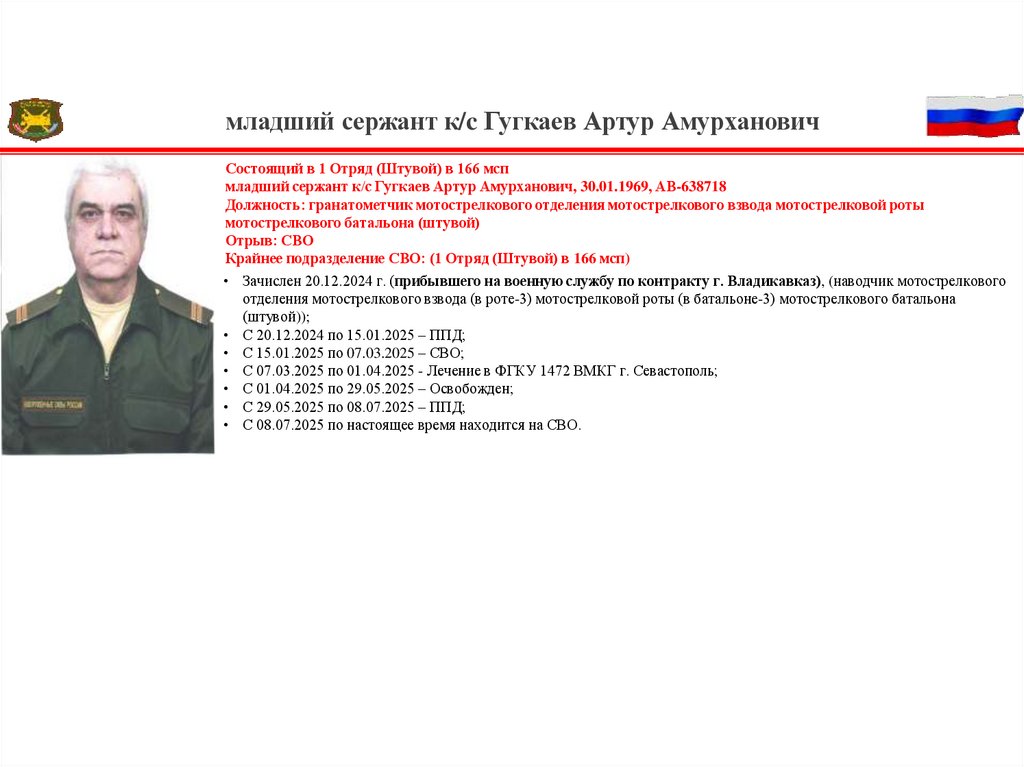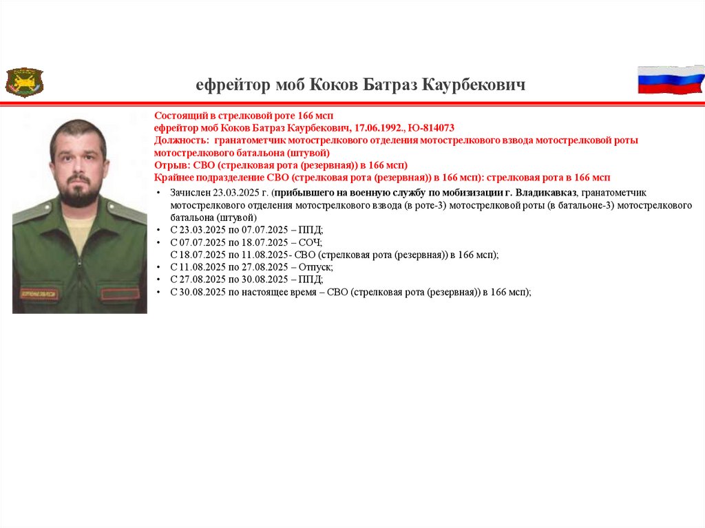 • Зачислен 23.03.2025 г. (прибывшего на военную службу по мобизизации г. Владикавказ, гранатометчик