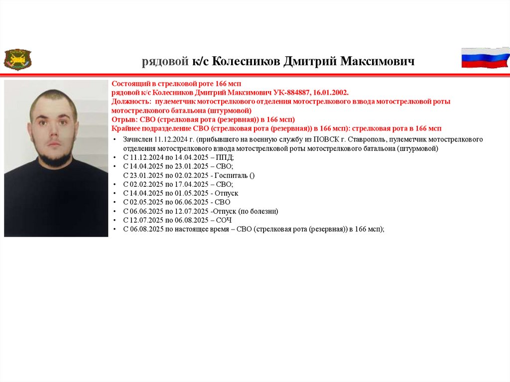 рядовой к/c Колесников Дмитрий МаксимовичСостоящий в стрелковой роте 166 мсп