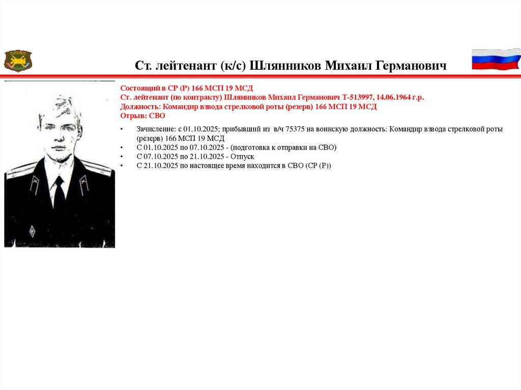 Ст. лейтенант (к/с) Шлянников Михаил ГермановичСостоящий в СР (Р) 166 МСП 19 МСД
