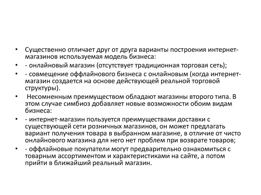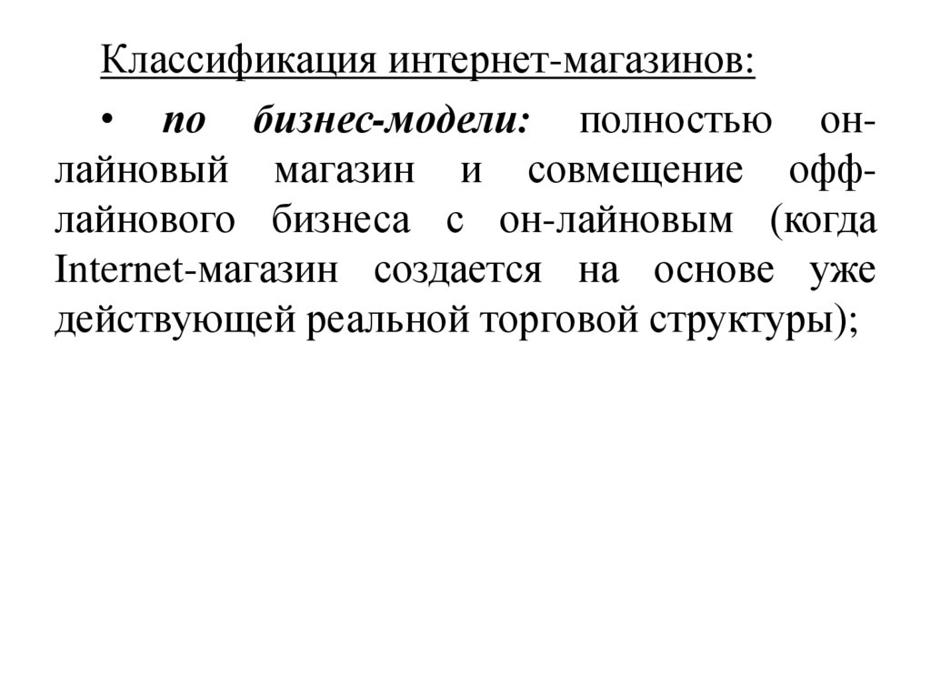 • - совмещение оффлайнового бизнеса с онлайновым (когда интернетмагазин создается на основе действующей реальной торговой