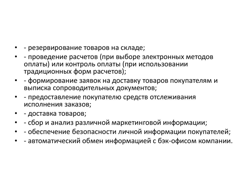 • - резервирование товаров на складе;• - проведение расчетов (при выборе электронных методов