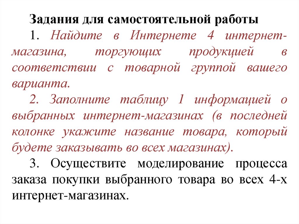 Задания для самостоятельной работы1. Найдите в Интернете 4 интернетмагазина,