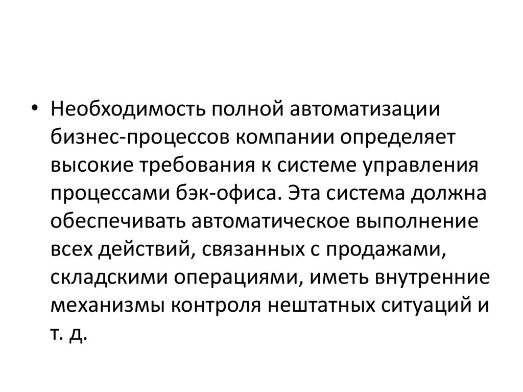 • Необходимость полной автоматизациибизнес-процессов компании определяет