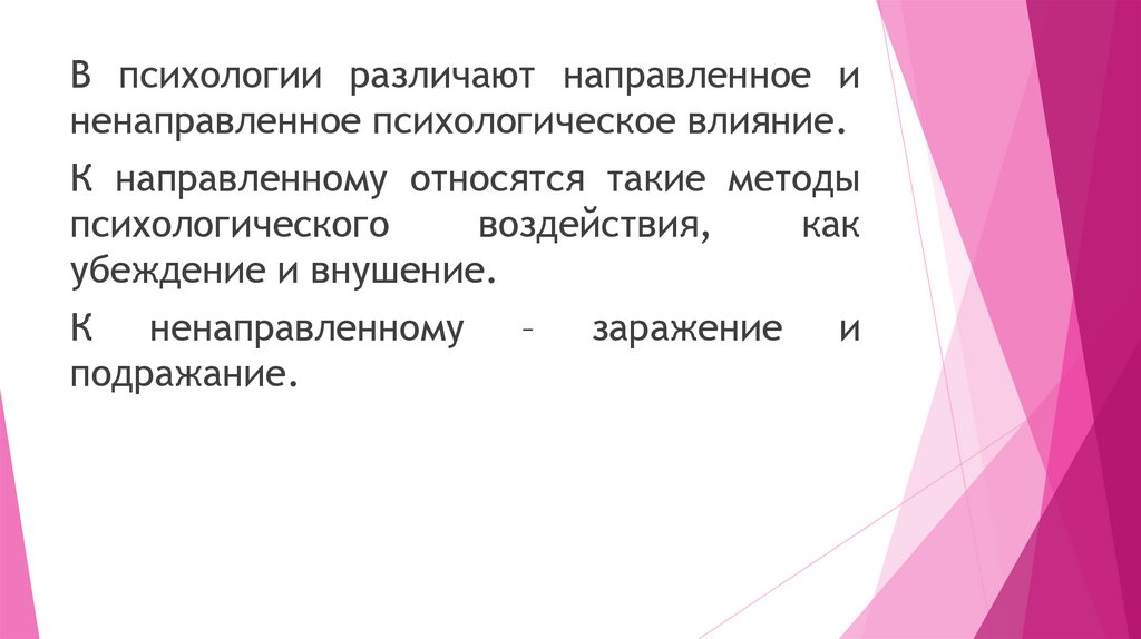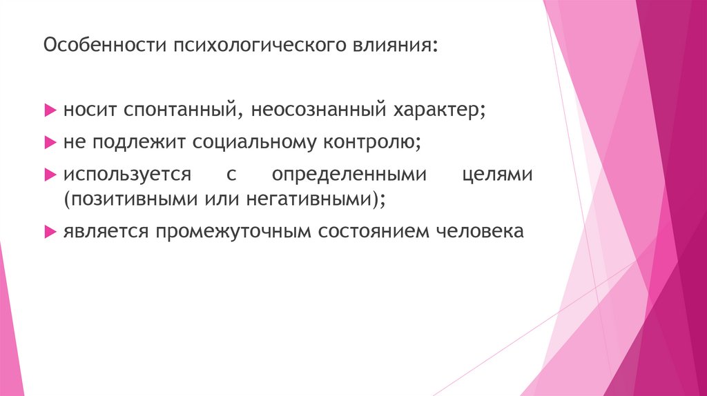 Особенности психологического влияния:носит спонтанный, неосознанный характер;