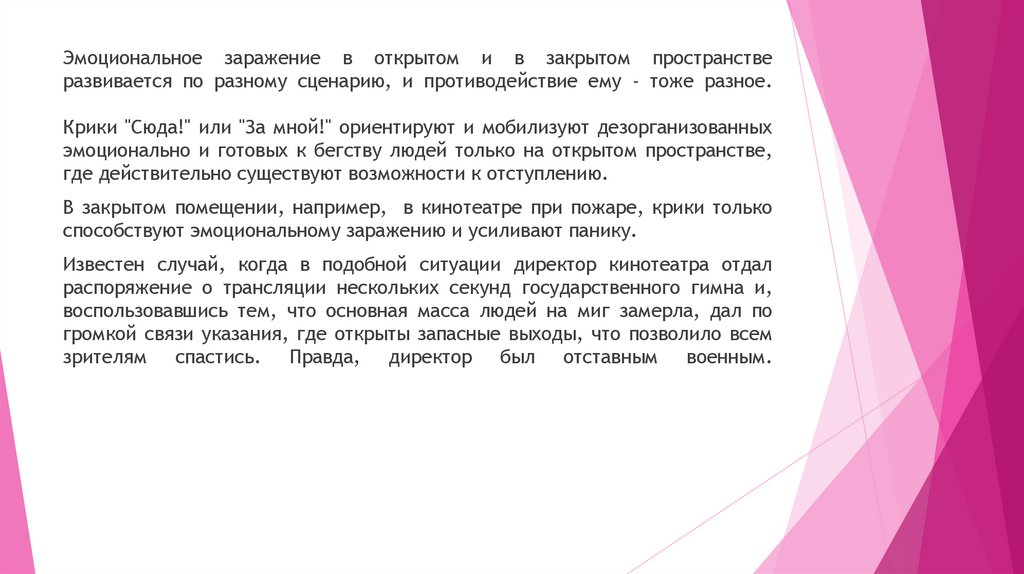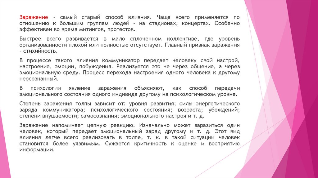 Заражение - самый старый способ влияния. Чаще всего применяется поотношению к большим группам людей – на стадионах, концертах. Особенно