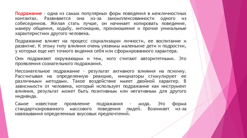 Подражание - одна из самых популярных форм поведения в межличностныхконтактах. Развивается она из-за закомплексованности одного из