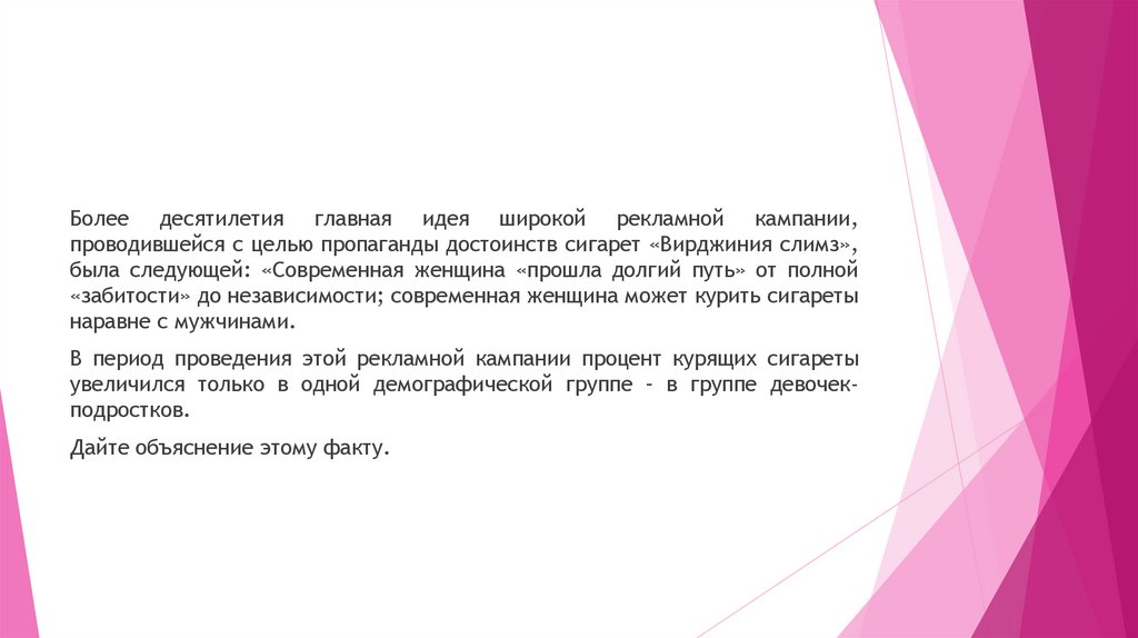 Более десятилетия главная идея широкой рекламной кампании,проводившейся с целью пропаганды достоинств сигарет «Вирджиния слимз»,