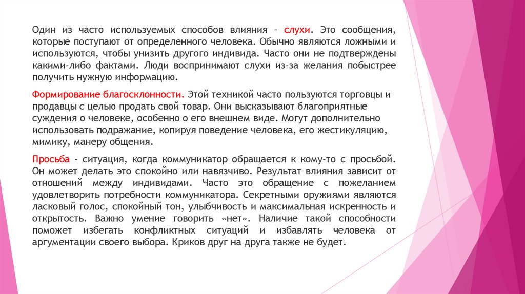 Один из часто используемых способов влияния – слухи. Это сообщения,которые поступают от определенного человека. Обычно являются ложными и