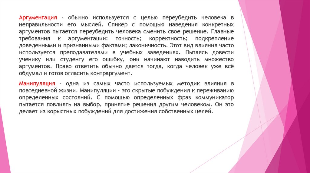 Аргументация - обычно используется с целью переубедить человека внеправильности его мыслей. Спикер с помощью наведения конкретных