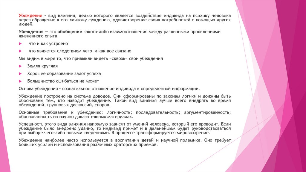 Убеждение – вид влияния, целью которого является воздействие индивида на психику человекачерез обращение к его личному суждению, удовлетворение своих потребностей с помощью других