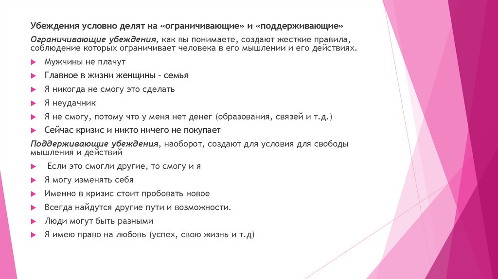 Убеждения условно делят на «ограничивающие» и «поддерживающие»Ограничивающие убеждения, как вы понимаете, создают жесткие правила,