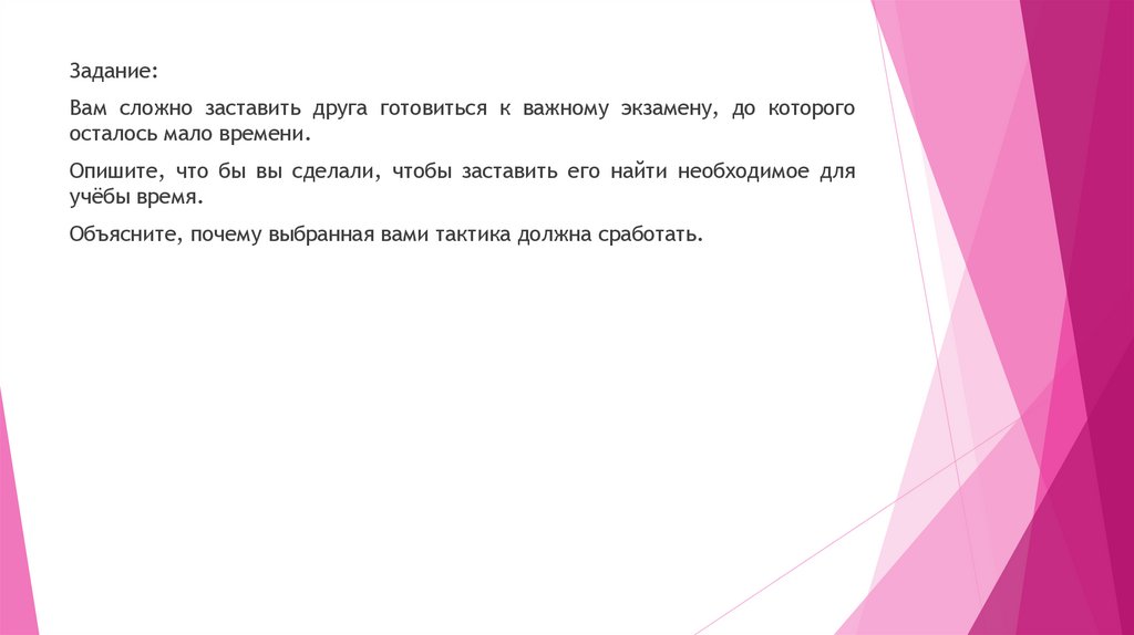 Задание:Вам сложно заставить друга готовиться к важному экзамену, до которого