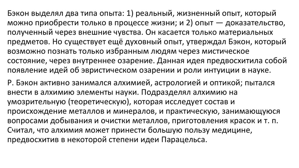 Бэкон выделял два типа опыта: 1) реальный, жизненный опыт, которыйможно приобрести только в процессе жизни; и 2) опыт — доказательство,