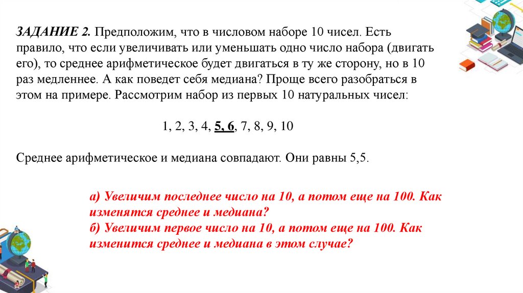 Решение задания №2.а) Если увеличить последнее число 10 на 10, то среднее арифметическое увеличится на 1 и