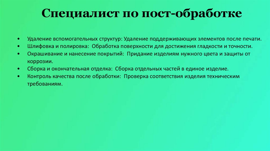 Специалист по пост-обработкеУдаление вспомогательных структур: Удаление поддерживающих элементов после печати.