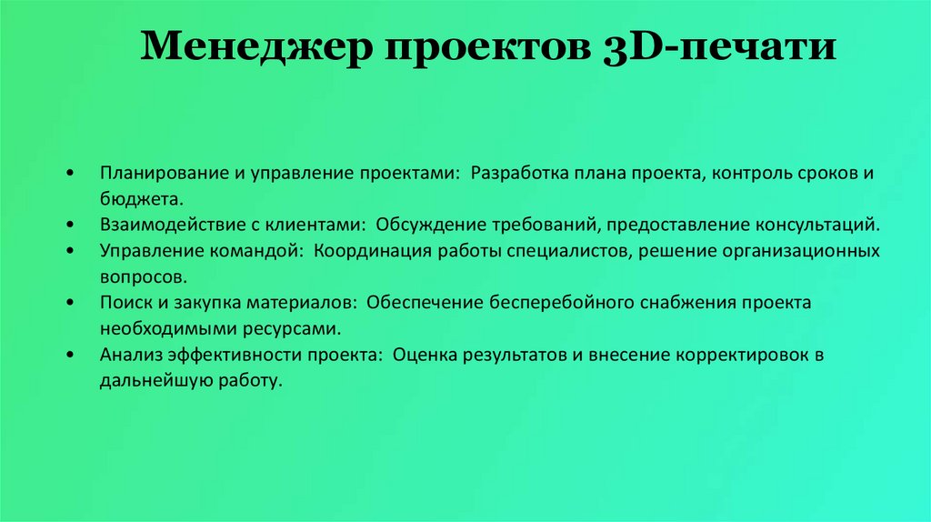 Менеджер проектов 3D-печатиПланирование и управление проектами: Разработка плана проекта, контроль сроков и